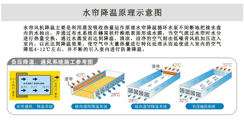 水簾墻降溫系統(tǒng)是水蒸發(fā)吸熱原理,負(fù)壓通風(fēng)原理,來排出廠房內(nèi)的廢氣、污氣及解除高溫悶熱。