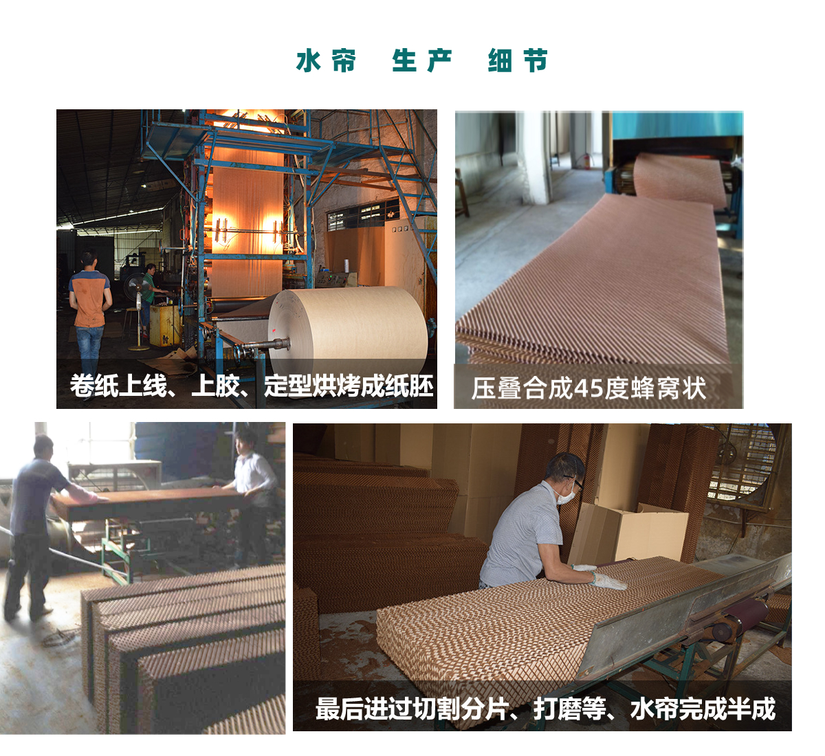 按波紋夾角可分為45度+45度、30度+60度、45度+15度,水簾紙的型號有5090、5060、7090、6090、7060、9090、9060。降溫水簾常用的型號是7090,根據(jù)不同需要也可以制作成其他型號。